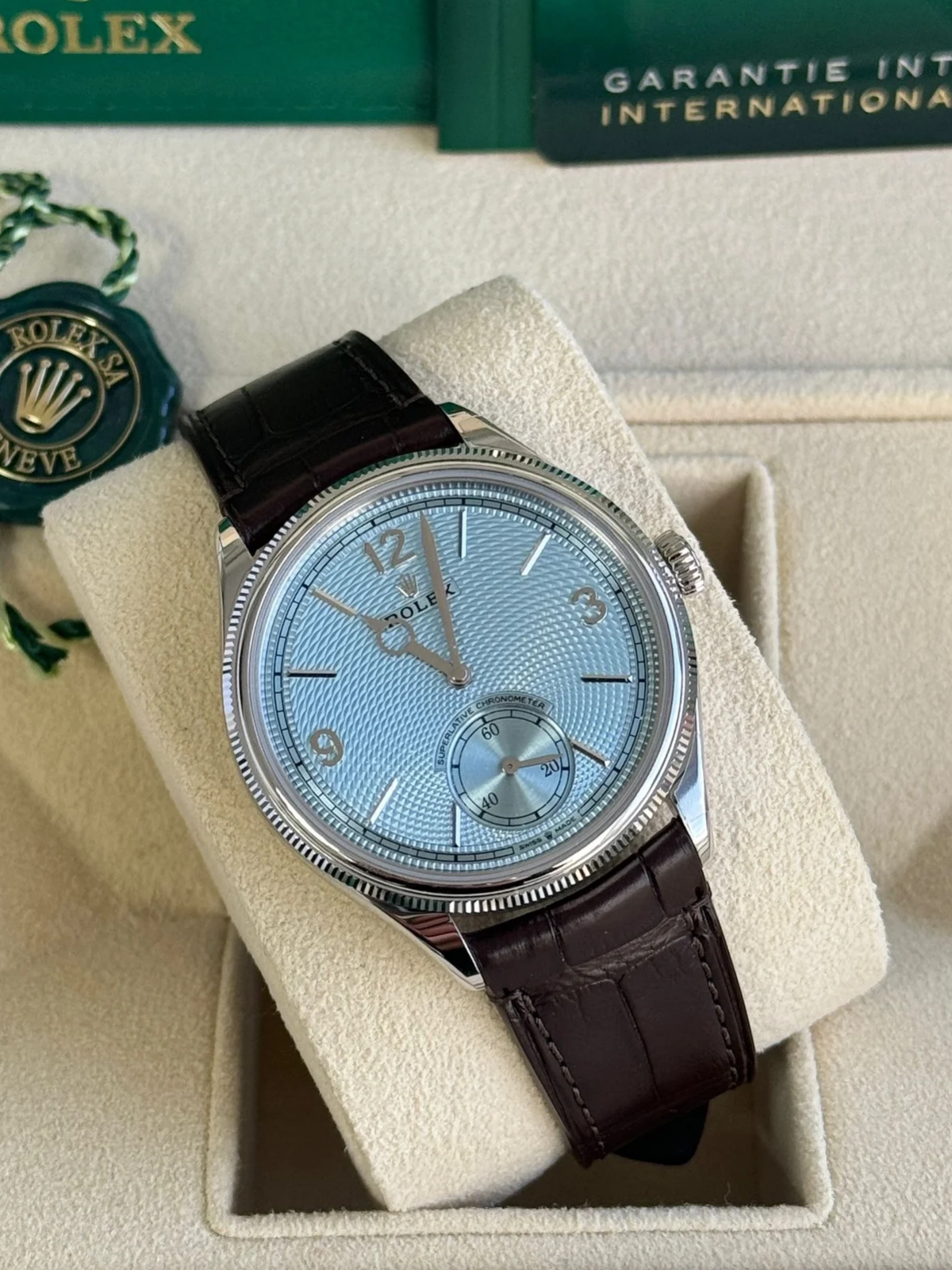 【Super Clone】ROLEX 1908 Platinum Ice Blue Dial Brown Alligator Strap - 52506-0002